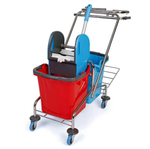 Tento kvalitný upratovací vozík s robustnou kovovou pochrómovanou konštrukciou a s dvoma vedrami zodpovedá vysokým hygienickým štandardom pre upratovanie. Rám vozíka je vyrobený z kvalitného nehrdzavejúceho materiálu s vysokou odolnosťou voči poškodeniu. Rukoväť vozíka je vyrobená z pevnej chrómovanej kovovej trubky a je na obe strany preklápateľná. Vozík obsahuje 2 ks vedier, ktoré sú farebne rozlíšené s objemom 25 litrov. Obsahuje kvalitný žmýkací lis na žmýkanie mopov. Má 4 otočné kolieska s plastovými chráničmi proti poškodeniu koliesok a stien.